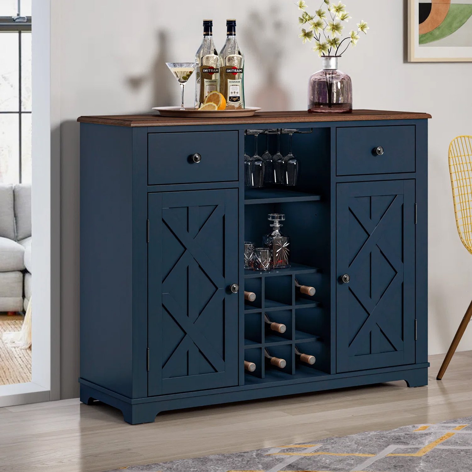 Navy Blue Farmhouse Style Wine Cabinet | Multi-Storage Home Bar Essential for Retailers-WC-K03