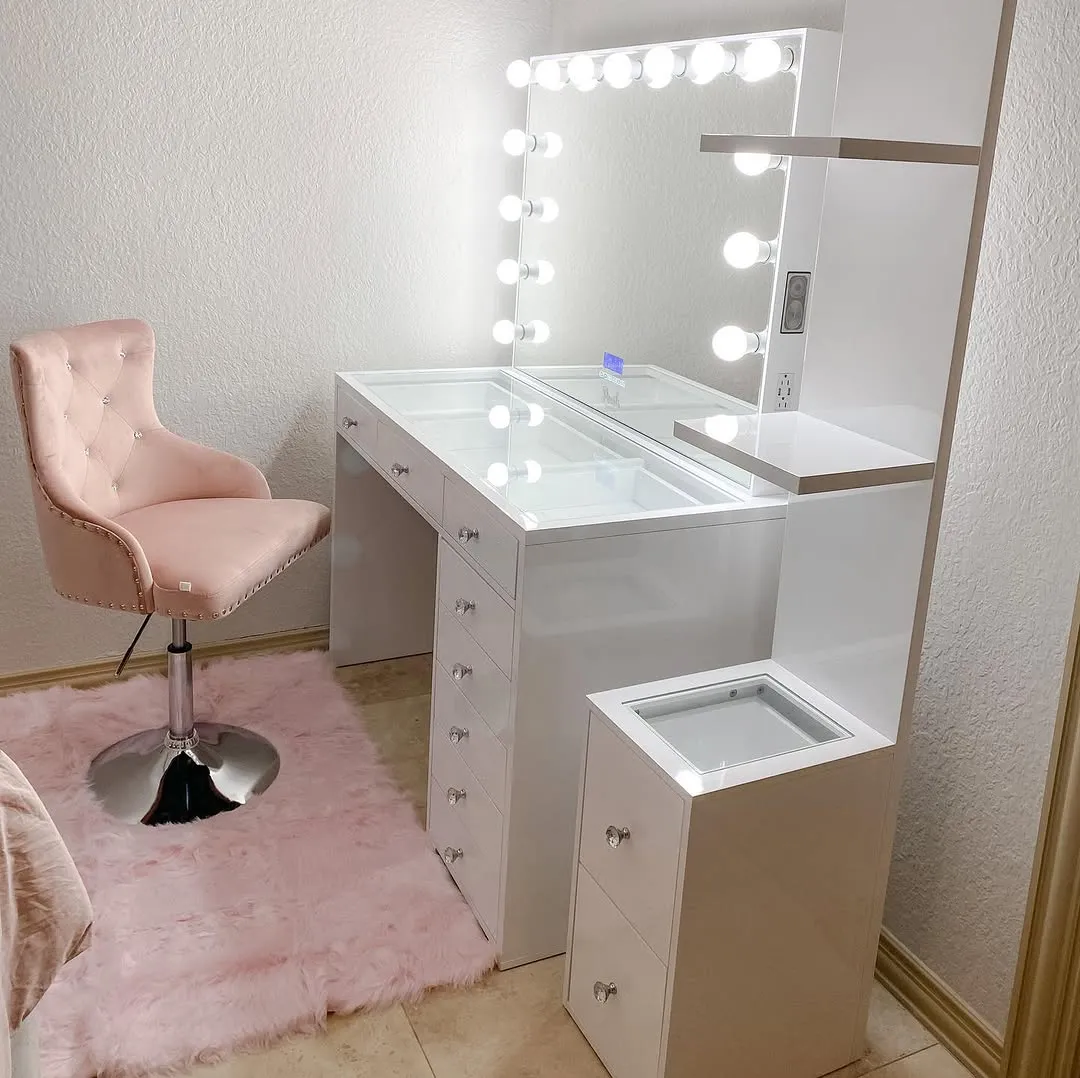Enhance your wholesale portfolio with this blush pink Hollywood-style LED vanity, integrating a surround bulb mirror and ample multi-drawer storage. It caters to teen beauty enthusiasts and girly-style lovers seeking a sweet yet glamorous makeup space, while providing your retail business with a trend-aligned, functional solution. Leveraging charming craftsmanship, it captures demand for Hollywood-inspired beauty furniture and elevates your brand’s competitiveness.