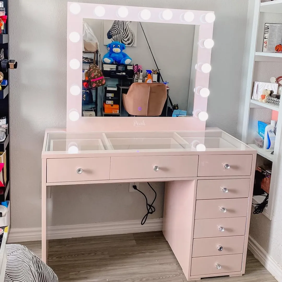 Blush Pink Hollywood-Style LED Vanity with Multi-Drawers | Sweet Glam Makeup Station for Retailers-JMJ-DT017