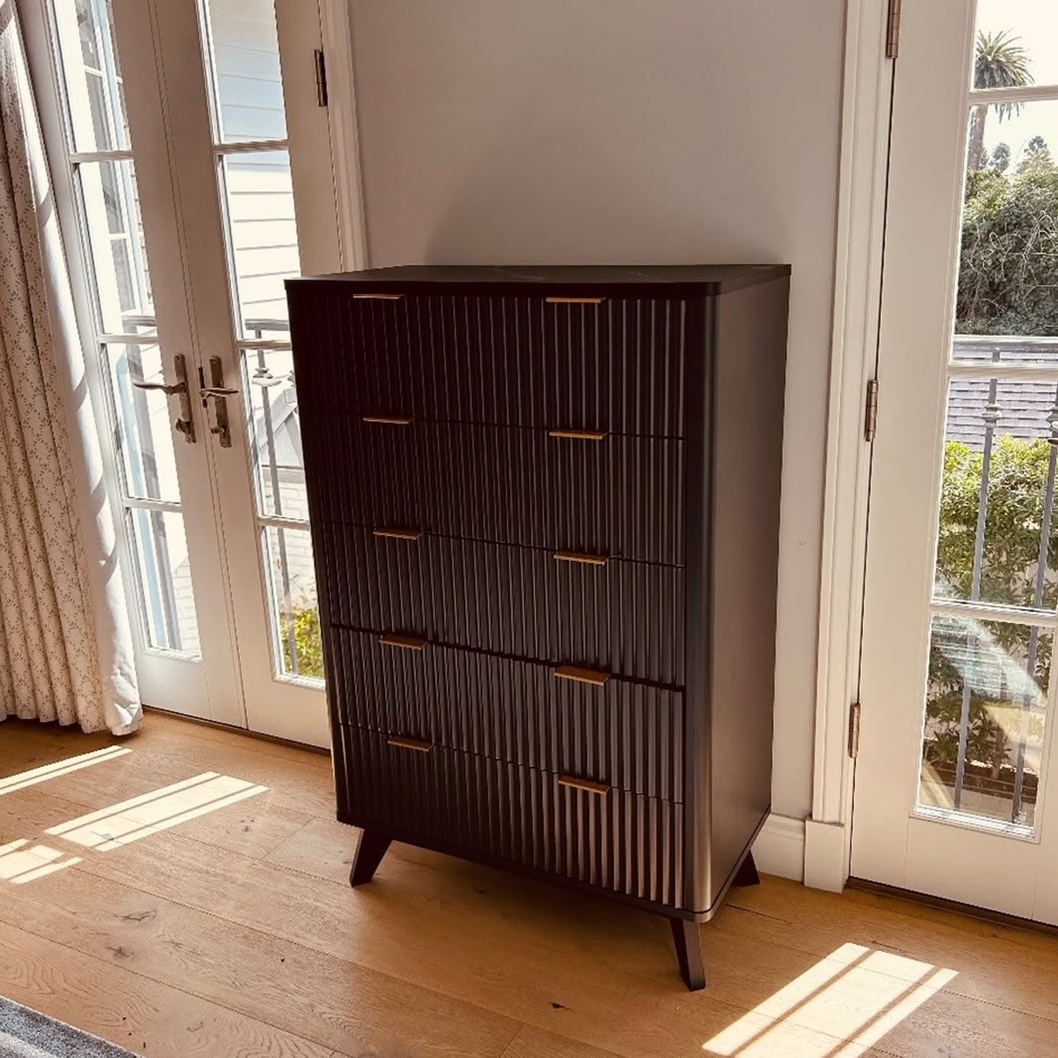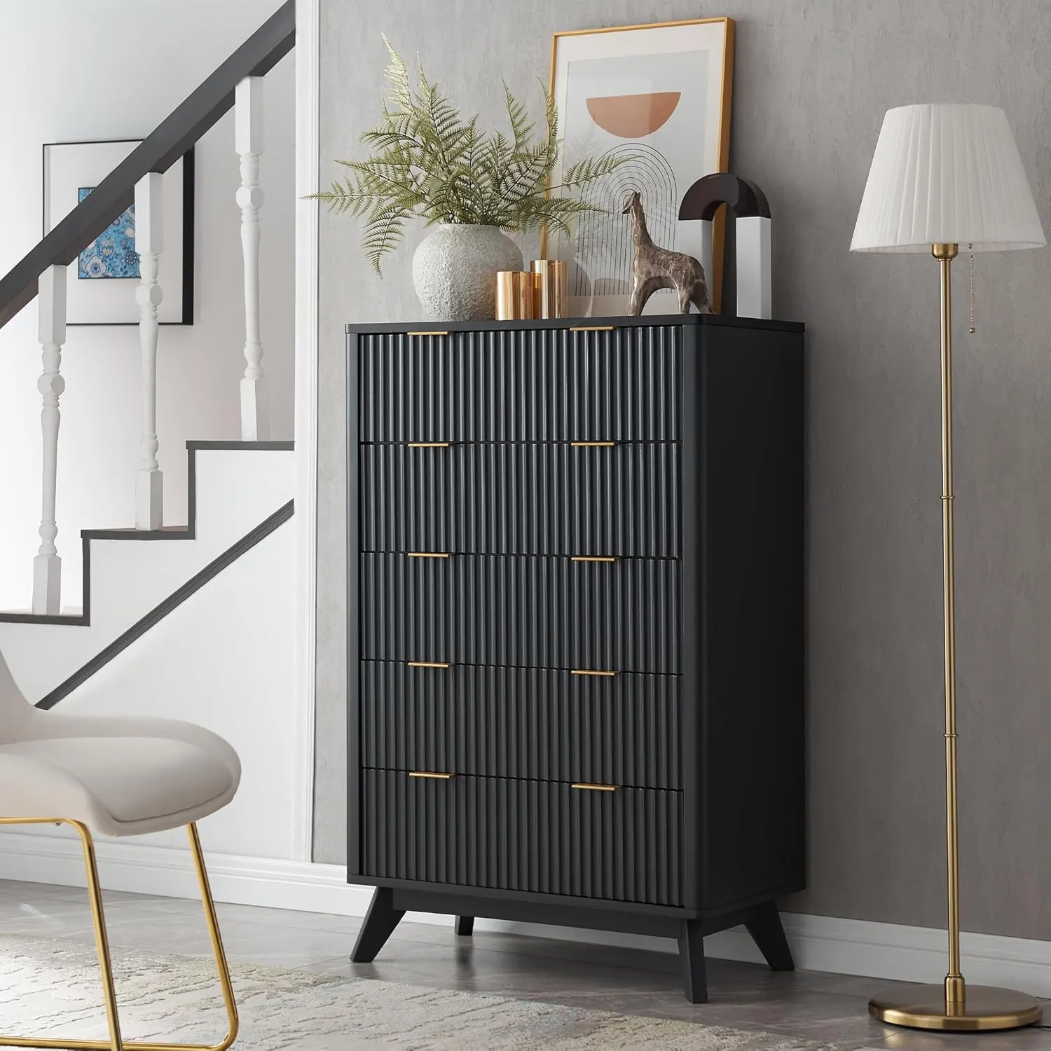 Elevate your home storage and decor with this dark wood mid-century modern 5-drawer chest, integrating vertical slat details, gold accents, and ample drawer space. It caters to homeowners seeking a stylish, organized storage solution for bedrooms or living rooms, while providing your retail business with a trend-aligned option for mid-century modern and contemporary decor lovers. With its exquisite craftsmanship, it meets the demand for multi-purpose home storage furniture and enhances your brand’s competitiveness in the market.