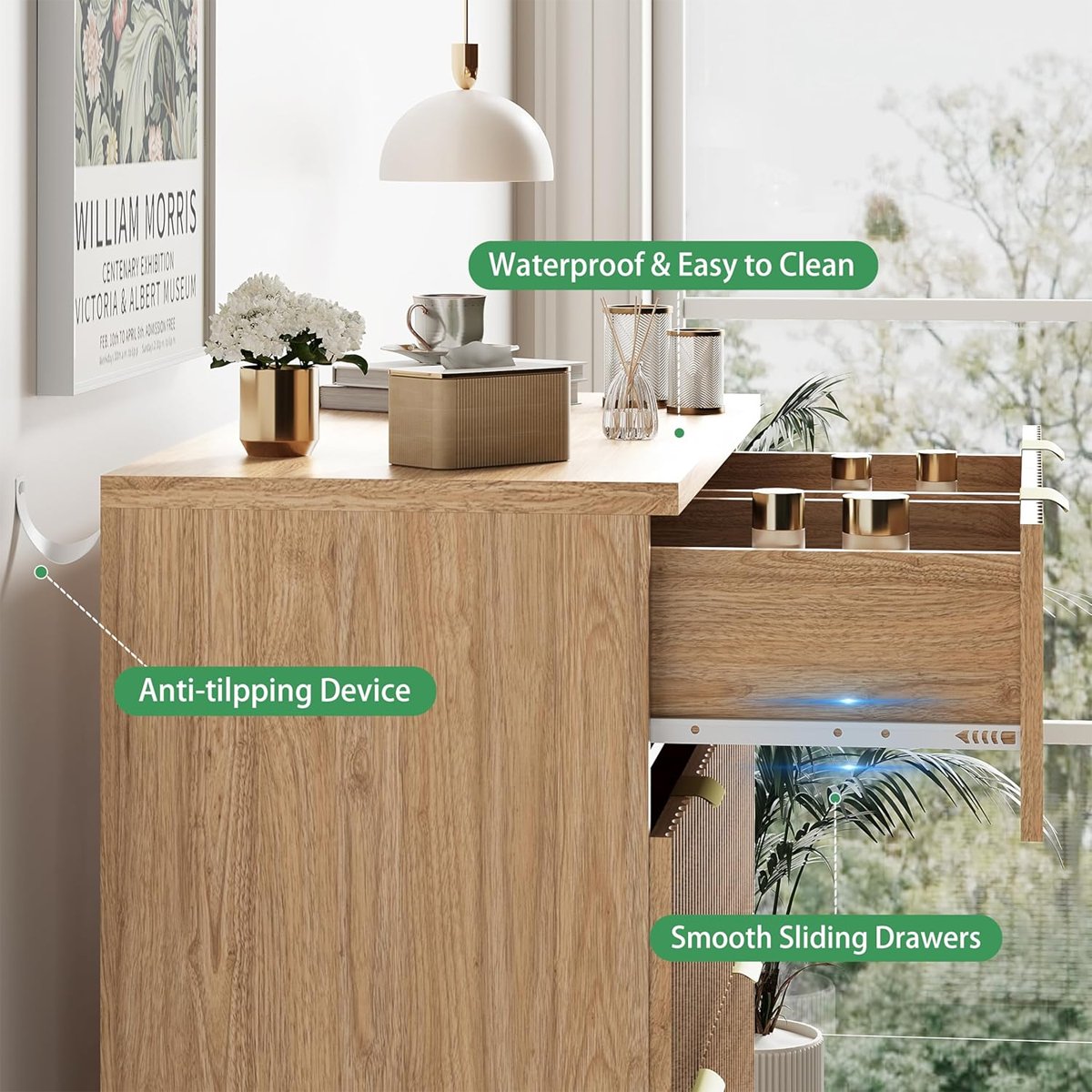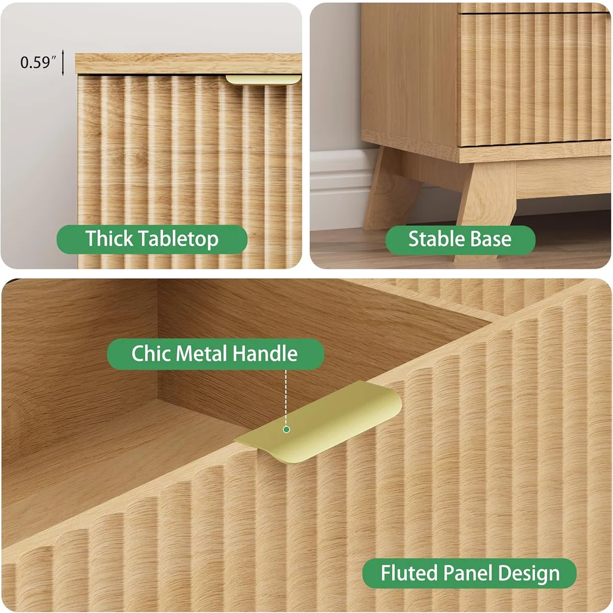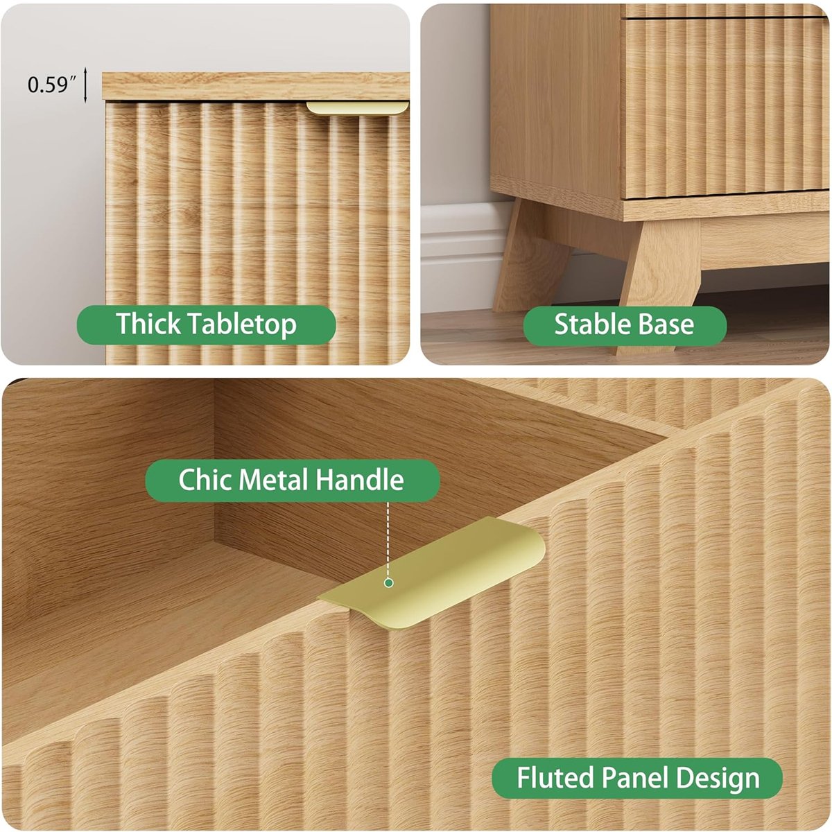 • Modern Minimalist Design: Light wood finish with fluted front and gold hardware, fitting seamlessly with modern minimalist, Scandinavian, and natural decor styles. Complements home accents like mirrors, plants, and artwork.