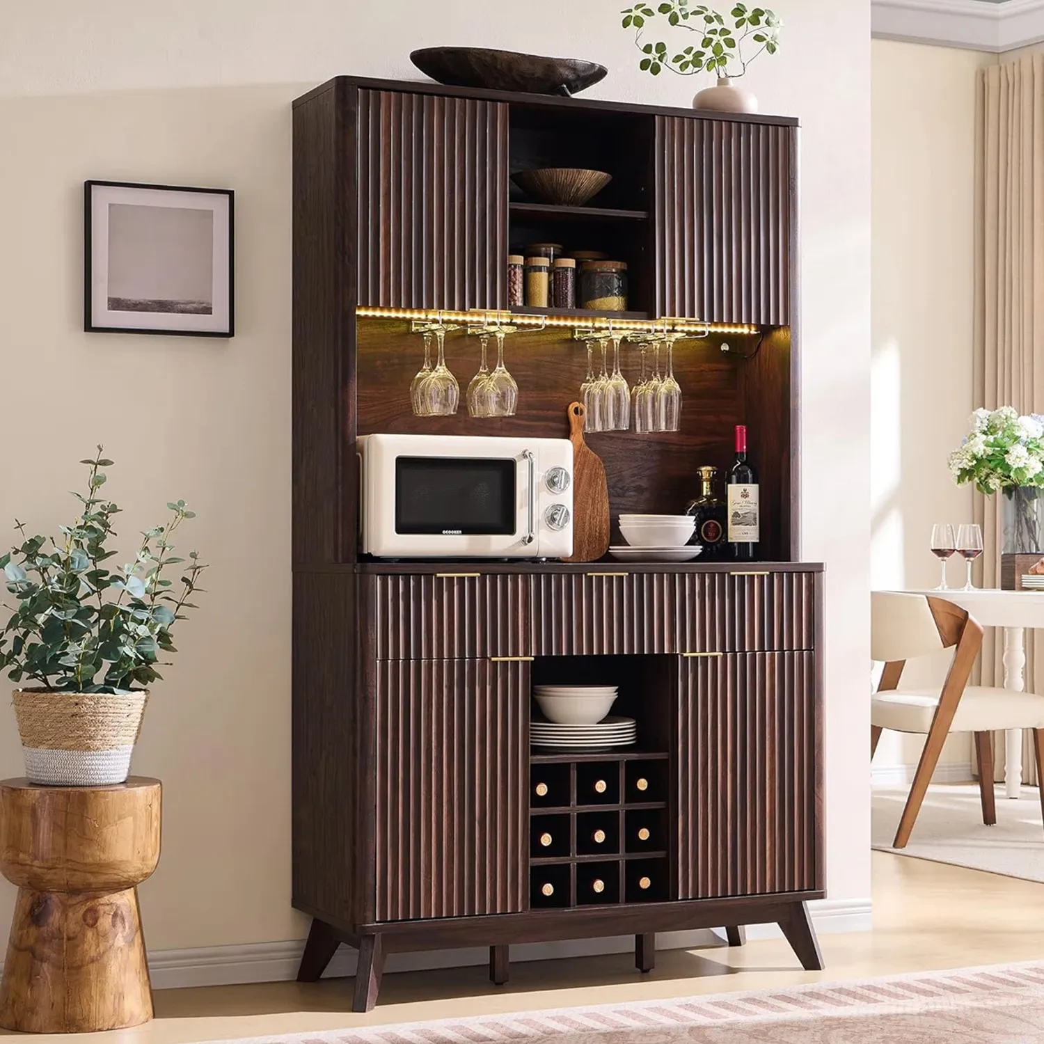 • Multi-Zone Wine & Kitchen Storage: Features wine racks, glass hanging racks, and appliance space to organize wine, glassware, kitchenware, and small appliances like microwaves, solving clutter pain points in kitchen and dining areas.