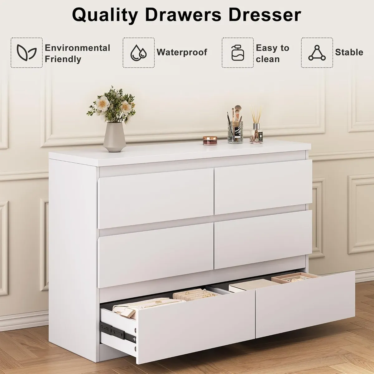 About This ProductThis white 6-drawer dresser with a minimalist design is engineered for modern home organization, merging sleek aesthetics and multi-drawer storage. It caters to homeowners’ need for tidy living spaces and offers retailers an OEM/ODM-friendly, trend-aligned option. Its blend of practicality and style enhances brand competitiveness in the furniture market.