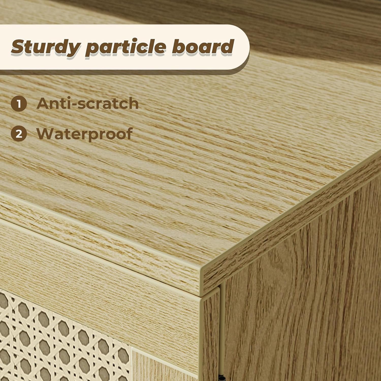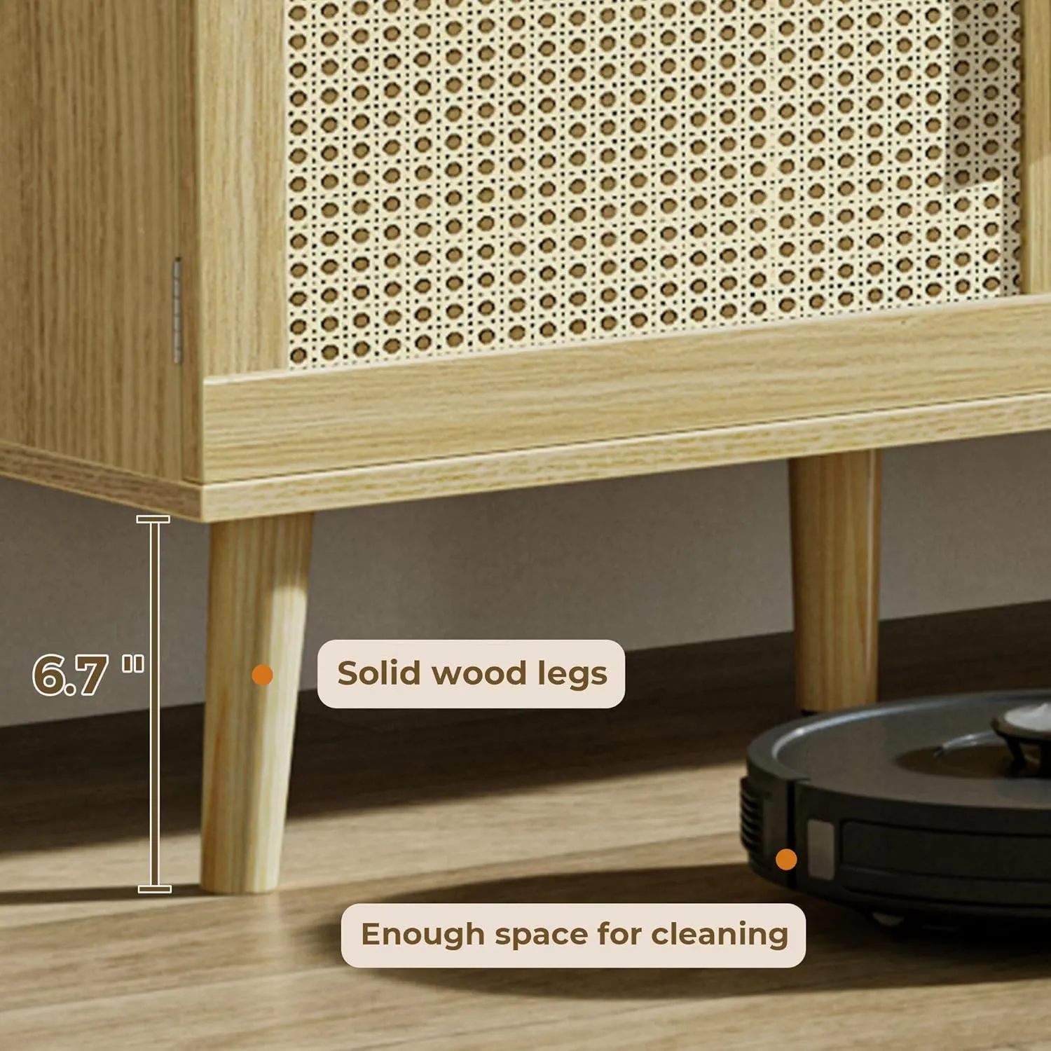 • Scandinavian Aesthetic: Light wood finish with rattan doors, embodying Nordic and bohemian decor styles. It complements art pieces, dried flower arrangements, and minimalist ornaments, serving as a focal point in living areas.