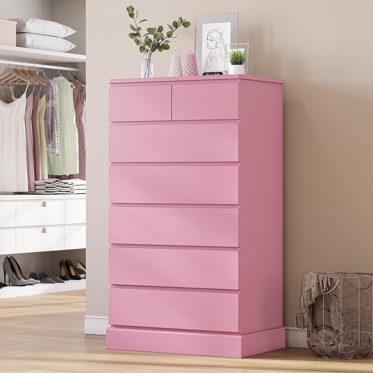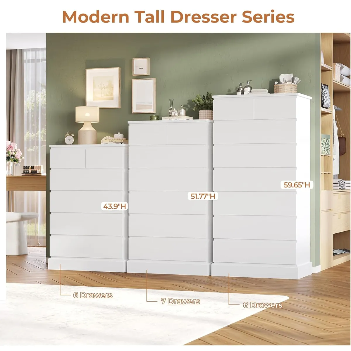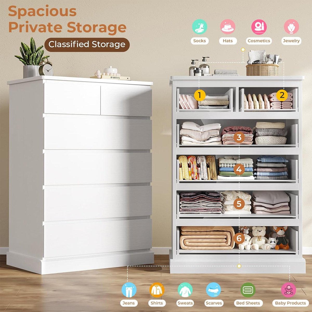 This white 6-drawer tall dresser features a modern minimalist design, ideal for bedroom storage. With its sleek profile and six drawers, it balances aesthetic appeal and storage capacity, making it a practical choice for organizing clothing, accessories, and sundries.