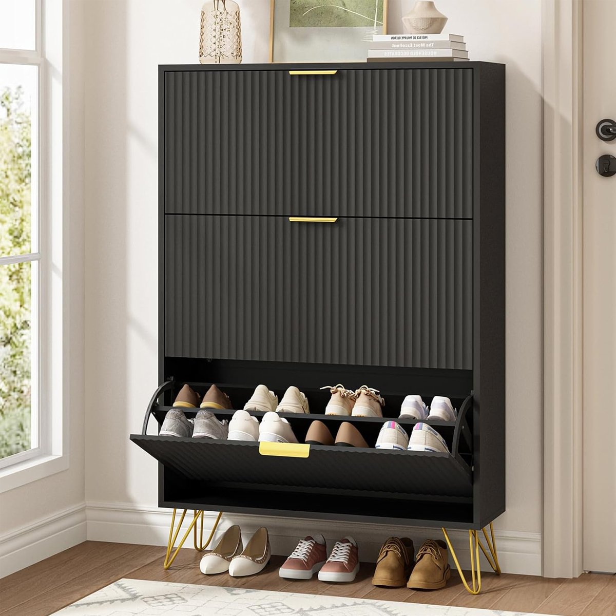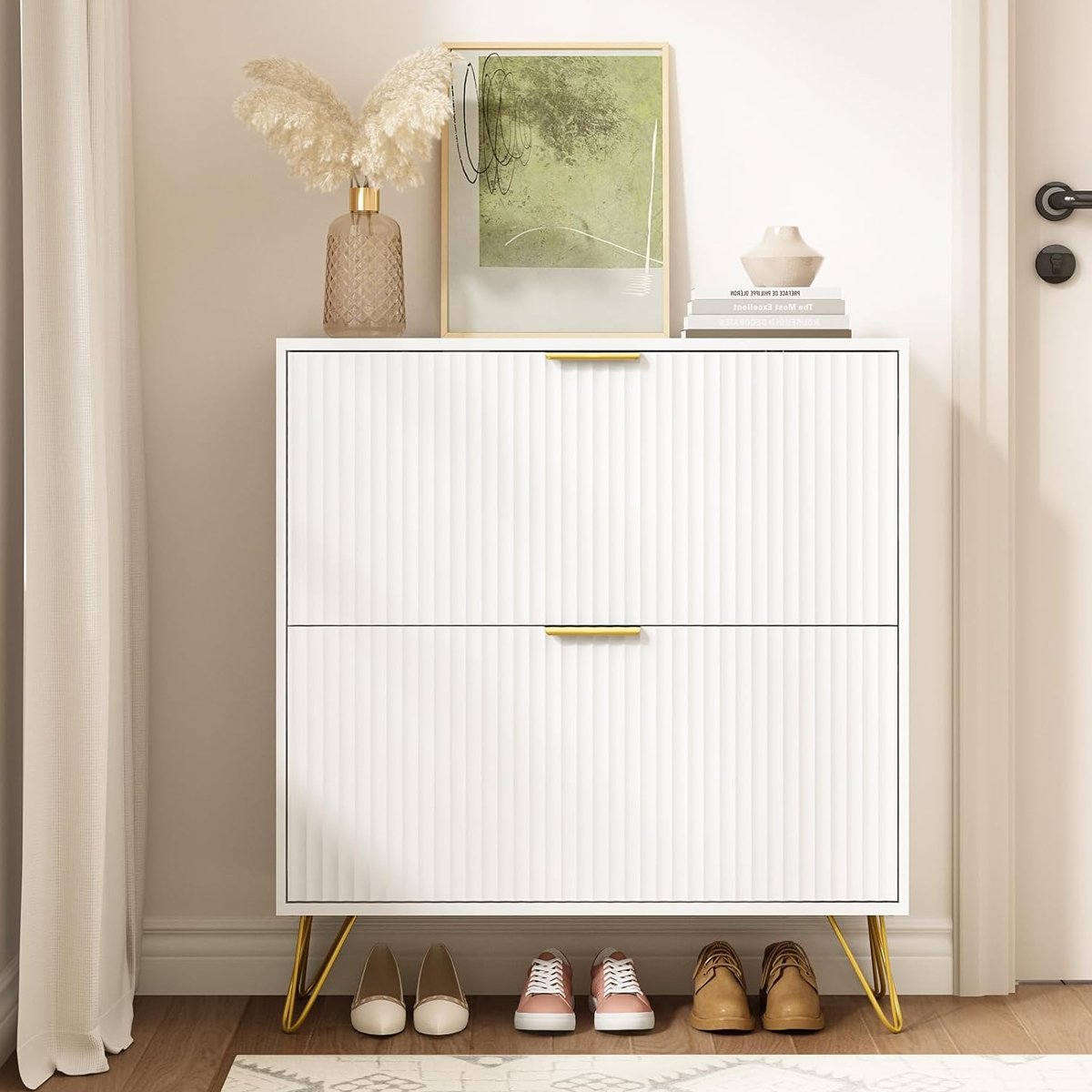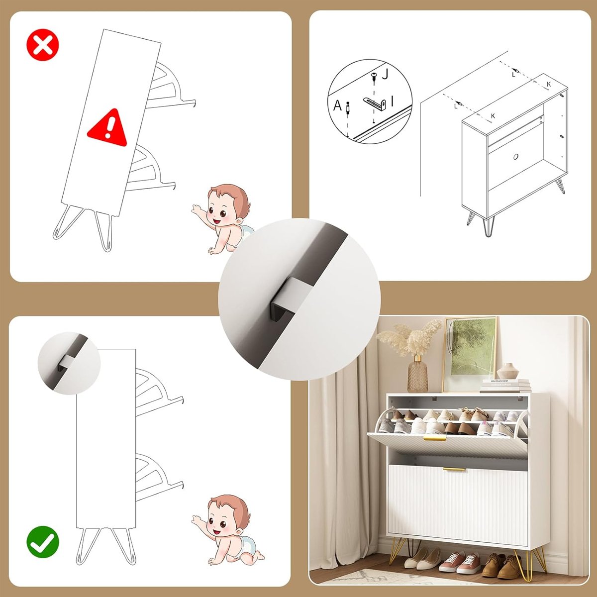 Enhance your wholesale inventory with this modern white flip-down shoe cabinet featuring gold accents, seamlessly combining commercial-grade durability with contemporary design. It addresses end-customers’ entryway organization needs while providing your retail business with a stylish, high-demand storage solution. Leveraging our consistent supply chain and sleek construction, it reduces your operational challenges, helps capture market trends, and elevates your inventory’s competitiveness in the home furniture segment.